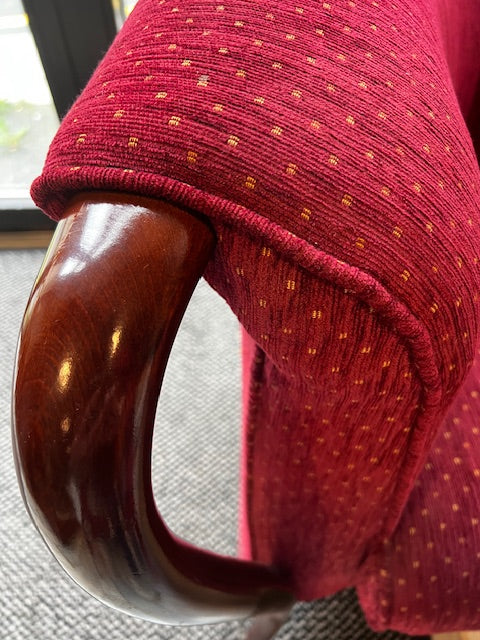 The deep red fabric, gracefully curved wooden armrests, and flowing lines reflect a classic vintage or Biedermeier style — adding both warmth and timeless charm to any space.