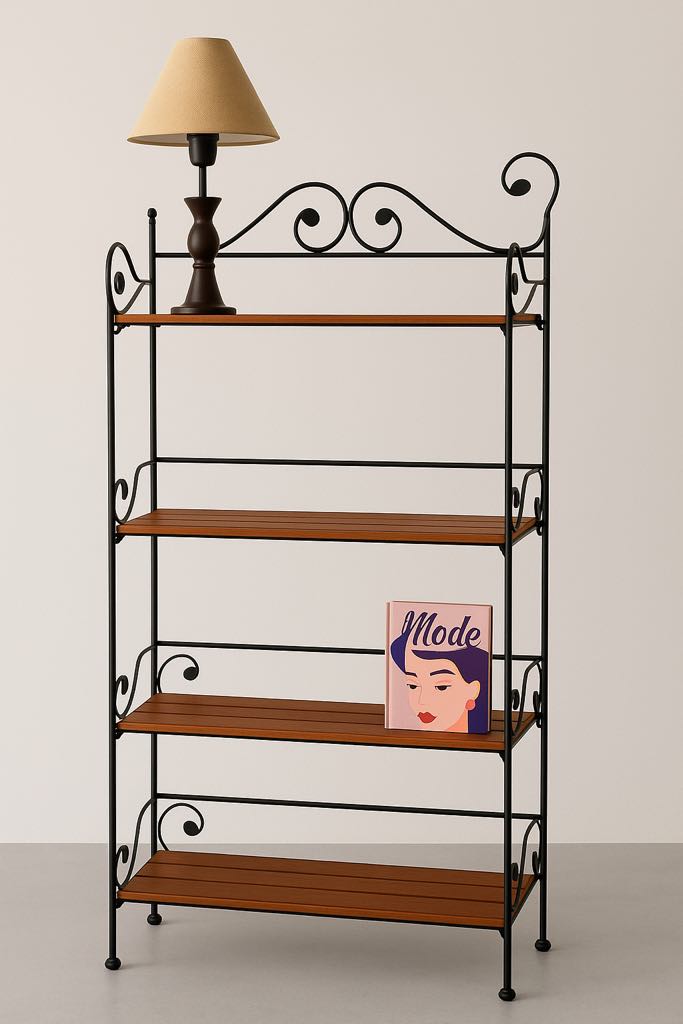 A beautiful and practical shelf, perfect for the living room, kitchen, or office. Built to last, it features a sturdy wrought iron frame and warm-toned acacia wood shelves.